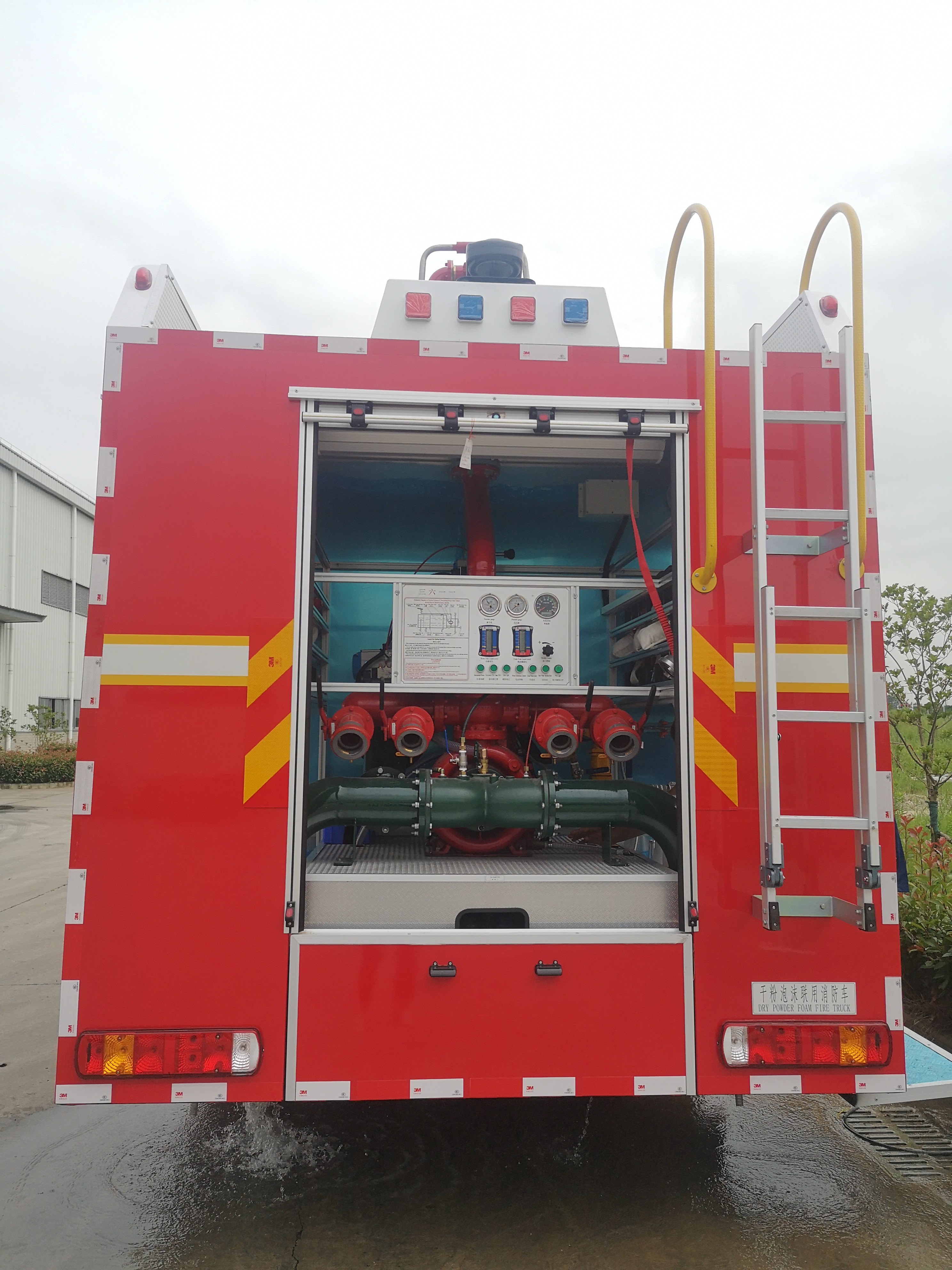 Die Ausrüstung und Löschmittel an Bord sind eine Kombination aus Schaumlöschfahrzeug und Pulverlöschfahrzeug, die verschiedene Löschmittel gleichzeitig versprühen oder separat verwendet werden können.Geeignet zur Bekämpfung von brennbaren Gasen.Brennbare Flüssigkeiten, organische Lösungsmittel und elektrische Geräte sowie Brände allgemeiner Materie.